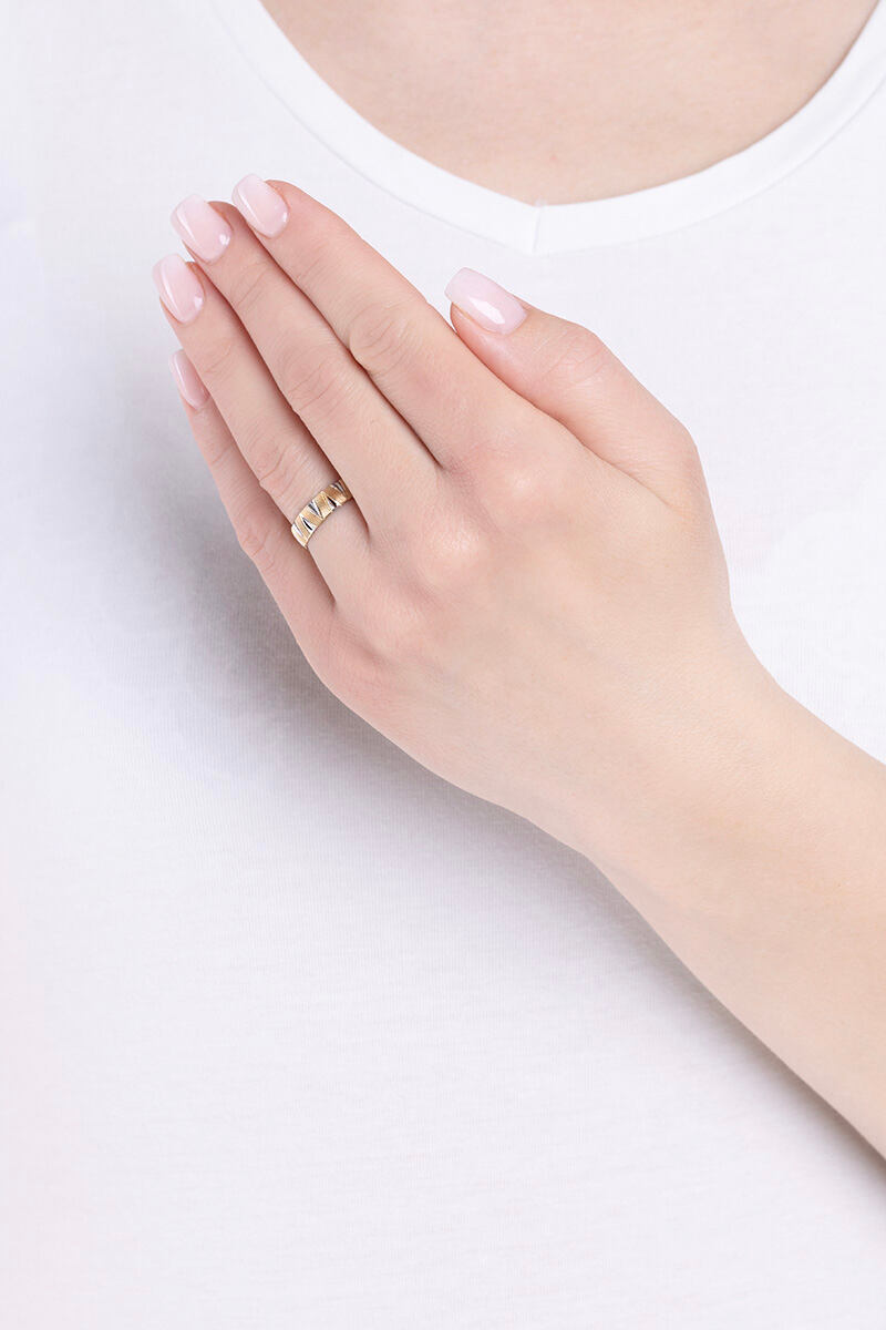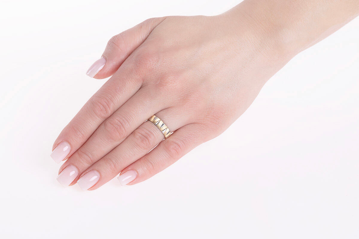 Zlatý snubní prsten Arleana ze žlutého a bílého 14kt zlata v lesklém broušeném provedení. Široký prsten zdobený klíny bílého a žlutého zlata, jež se střídají nejen barvou, ale také broušeným provedením. Klín z bílého 14kt zlata s jednoduchým výbrusem se střídá s jemně šrafovanými ze žlutého 14kt zlata. Navíc díky 14 karátovému zlatu, ze kterého je šperk vyroben, si prsten zachovává svojí dlouhotrvající vysokou hodnotu. Šířka prstenu: 5 mm Materiál: Žluté zlato Au 585/1000 (14kt), Bílé zlato Au 585/1000 (14kt) Povrch je leštěný, broušený. Prsten má českou puncovní značku pro ryzost zlata: 585.