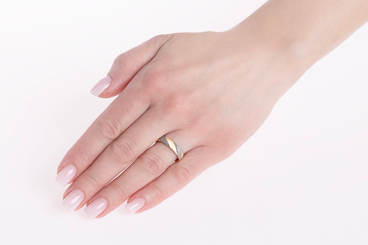 Zlatý prsten Roseann ze žlutého a bílého 14kt zlata v lesklém broušeném provedení. Široký prsten zdobený pruhy bílého a žlutého zlata, jež se střídají nejen barvou, ale také broušeným provedením. Pruh z bílého 14kt zlata působí jako jemné drobné cvočky, kdežto ze žlutého 14kt zlata je jemně šrafován úzkými pruhy. Lze použít i jako snubní prsten. Navíc díky 14 karátovému zlatu, ze kterého je šperk vyroben, si prsten zachovává svojí dlouhotrvající vysokou hodnotu. Šířka prstenu: 5 mm Materiál: Žluté zlato Au 585/1000 (14kt), Bílé zlato Au 585/1000 (14kt) Povrch je broušený. Prsten má českou puncovní značku pro ryzost zlata: 585.
