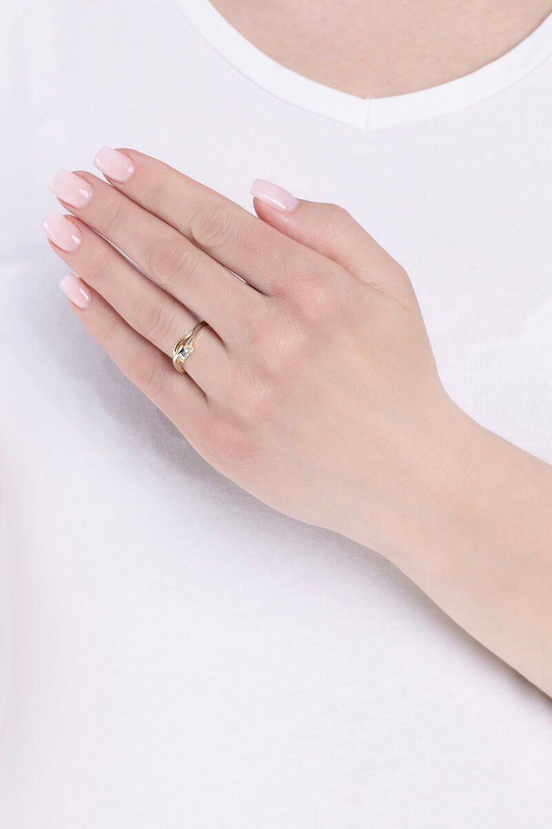 Zlatý prsten Alexia ze žlutého a bílého 14kt zlata v lesklém provedení. Původní kruh ze žlutého zlata je v přední části rozdělen na dvě vlnky, přičemž na jedné z nich jsou umístěny dva malé a mezi nimi jeden velký SILVEGO® Brilliance Zirconia. Ty jsou kryté linií z bílého zlata. Vhodný i jako zásnubní prsten. Navíc díky 14 karátovému zlatu, ze kterého je šperk vyroben, si prsten zachovává svojí dlouhotrvající vysokou hodnotu. Šířka prstenu: 1,8 mm Materiál: Žluté zlato Au 585/1000 (14kt), Bílé zlato Au 585/1000 (14kt) Povrch je leštěný. Prsten má českou puncovní značku pro ryzost zlata: 585. Kámen: SILVEGO® Brilliance Zirconia