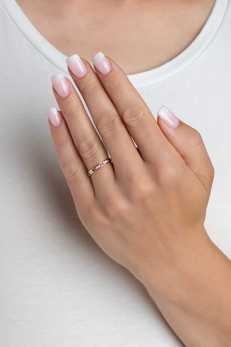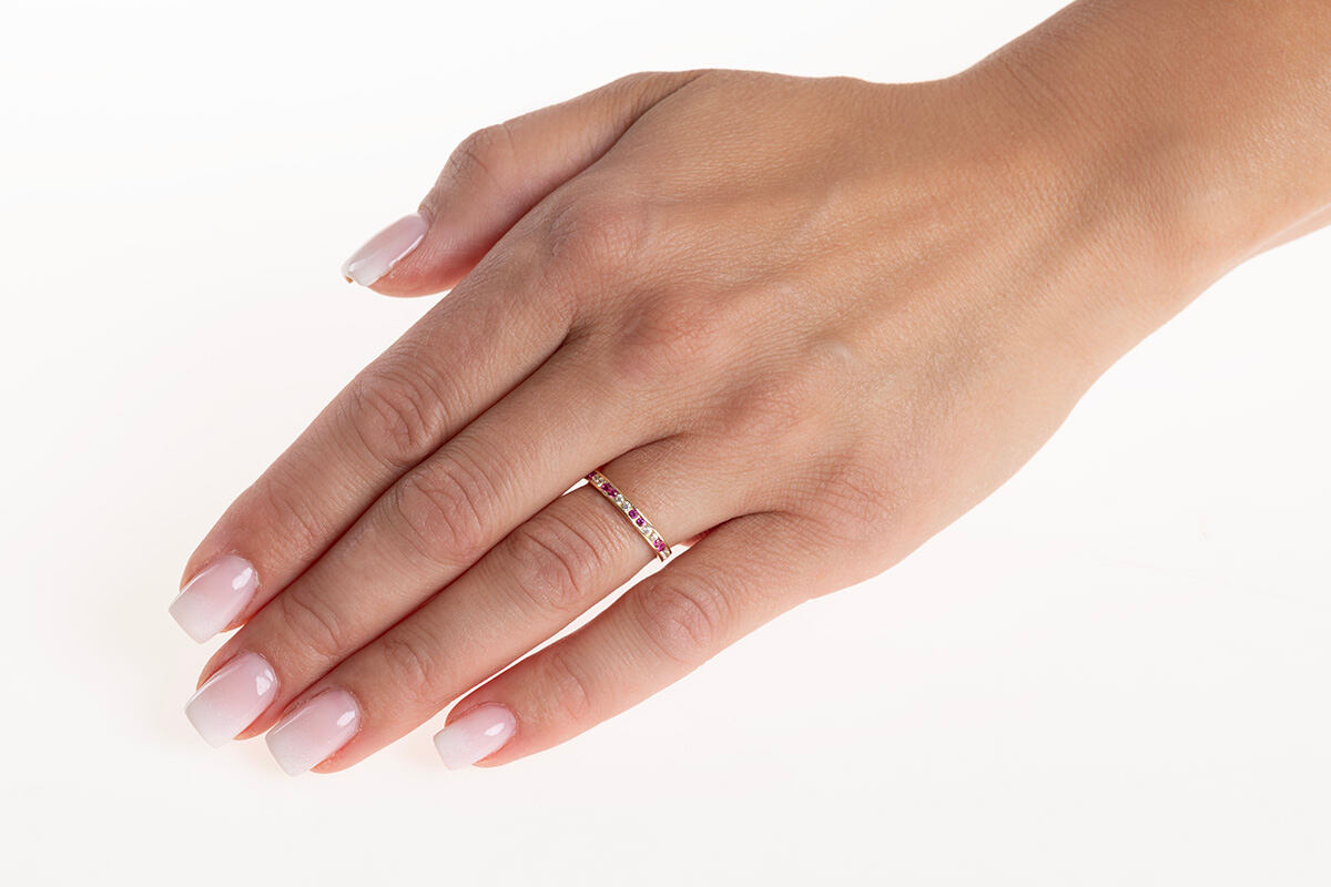 Zlatý prsten Mariane ze žlutého 14kt zlata s barevnými Brilliance Zirconia o šířce 2,3 mm. Prsten je velmi jemného provedení a je osázen ve střídavé řadě čirými a růžovými Brilliance Zirconia. Ideální dárek pro milovníky minimalismu a moderních designů. Tento zlatý dámský prsten je vhodný pro každodenní nošení, hodí se ale i jako zásnubní nebo snubní. Šíře prstenu: 2,3 mm Materiál: Žluté zlato Au 585/1000 (14 kt). Povrch je leštěný. Prsten má českou puncovní značku pro ryzost zlata: 585.